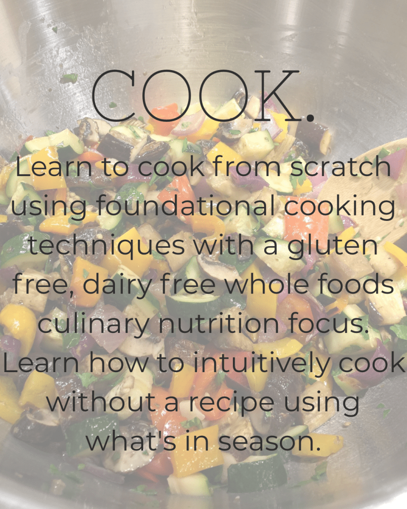 Learn to cook from scratch using foundational cooking techniques with a gluten free, dairy free whole foods culinary nutrition focus. Learn how to intuitively cook without a recipe using what’s in season.