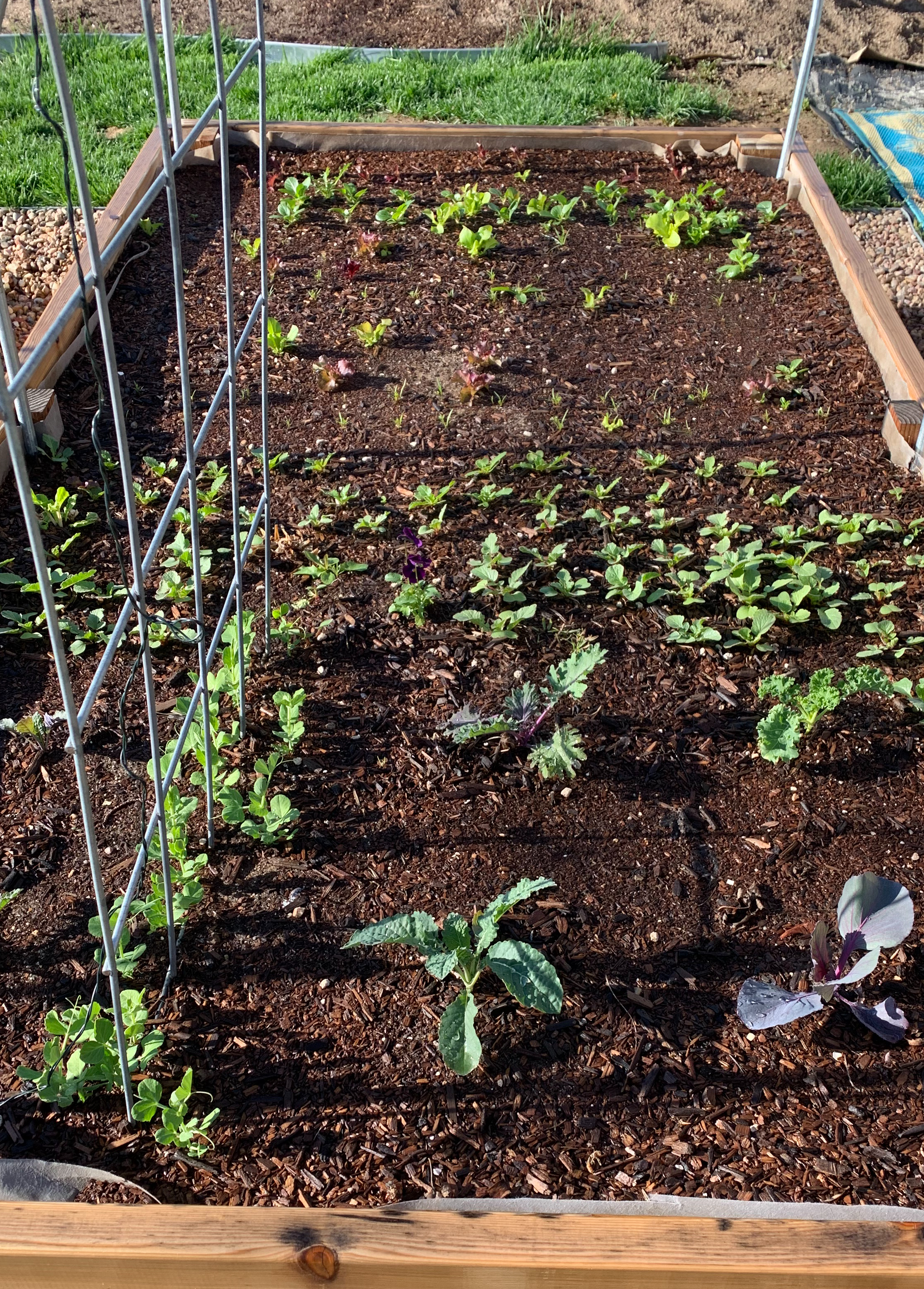 Other garden maintenance includes deeply watering your garden after checking each bed with the finger method. Just stick your finger into the soil and if it comes out dry or almost dry it’s time to water, if it comes out moist you can wait and check again the next day. Colorado weather in May can be all over the place, we may get rain for days and nothing for even longer. It is important to make sure your garden is getting 1 inch of water per week. Especially when establishing new transplants or starting seeds. Seeds need the moisture to germinate, if it is inconsistent the seed may start to germinate them stop growing. Check to make sure your watering method, if not by hand, doesn’t have any leaks, that timers are ready and that you watch the weather for rain. (No need to run the irrigation system if it has rained a bunch.) Make sure that you have some sort of hail protection at the ready! Hail season in Colorado can last from May to July, sometimes August. You can use pretty much anything you can to cover your plants that won’t smush them. I have used sheets, tarps, umbrellas, lightweight blankets, tables, etc. I now leave my hoops ups and have my thick frost cloth and sheets on stand by. I always check the weather and make sure everything is prepped just in case. (I have lost so many plants over the years to freak hailstorms.)